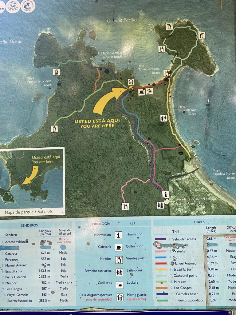 Der Nationalpark bietet gut ausgebaute Wanderwege, die zu spektakulären Aussichtspunkten und unberührten Stränden führen. Unterwegs begegnet man häufig Affen, Leguanen und zahlreichen Vogelarten. Da das Mitbringen von Essen verboten ist und Taschen am Eingang kontrolliert werden, sollte man sich darauf vorbereiten. Toiletten, Umkleidekabinen und Duschen sind vorhanden.