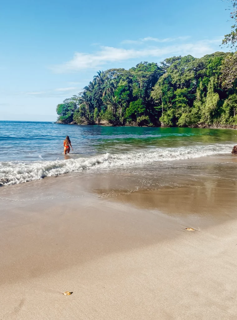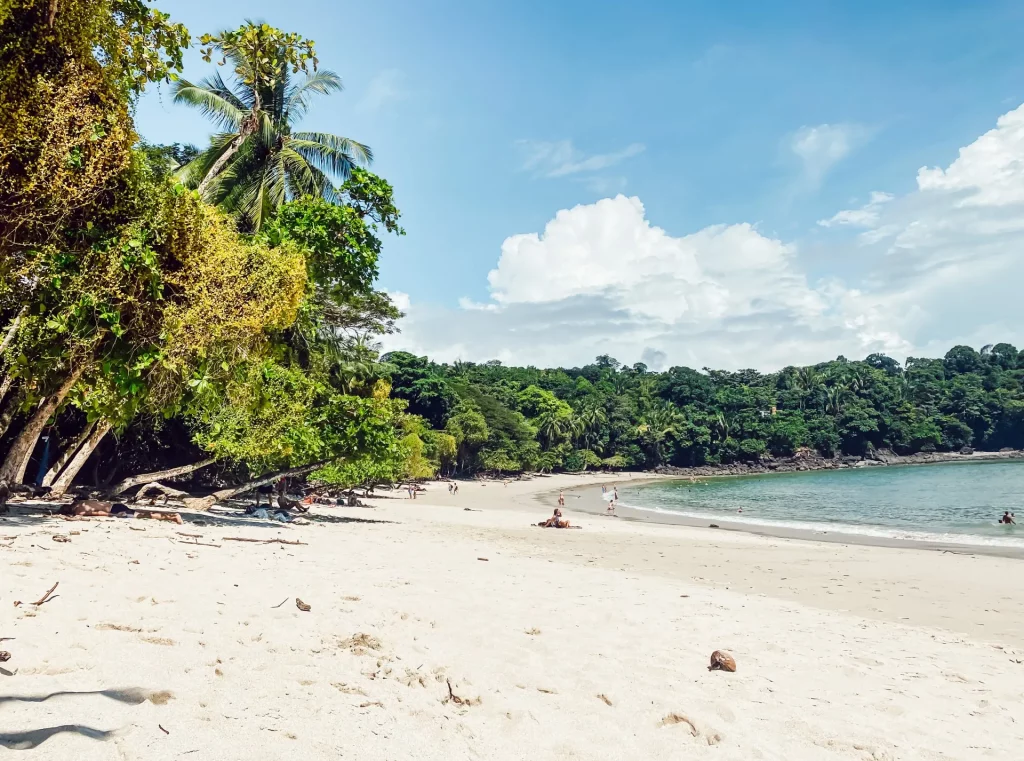 Der feine, weiße Sand und das ruhige, türkisfarbene Wasser machen diesen Strand perfekt zum Schwimmen und Entspannen. Da er innerhalb des Nationalparks liegt, ist die Umgebung unberührt und die Chancen stehen gut, exotische Tiere wie Affen, Faultiere oder Leguane in den Bäumen zu entdecken.