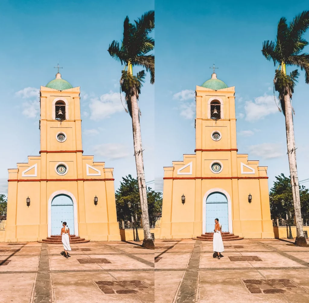 Viñales has a charming little town church that serves as an important meeting point for locals and tourists. The church is located in an idyllic square, surrounded by beautiful houses and trees, creating a peaceful and tranquil atmosphere. Next to the church is a building from which lively salsa music is often heard. In front of the building, some people were standing, inviting us to come closer and join in the dance.