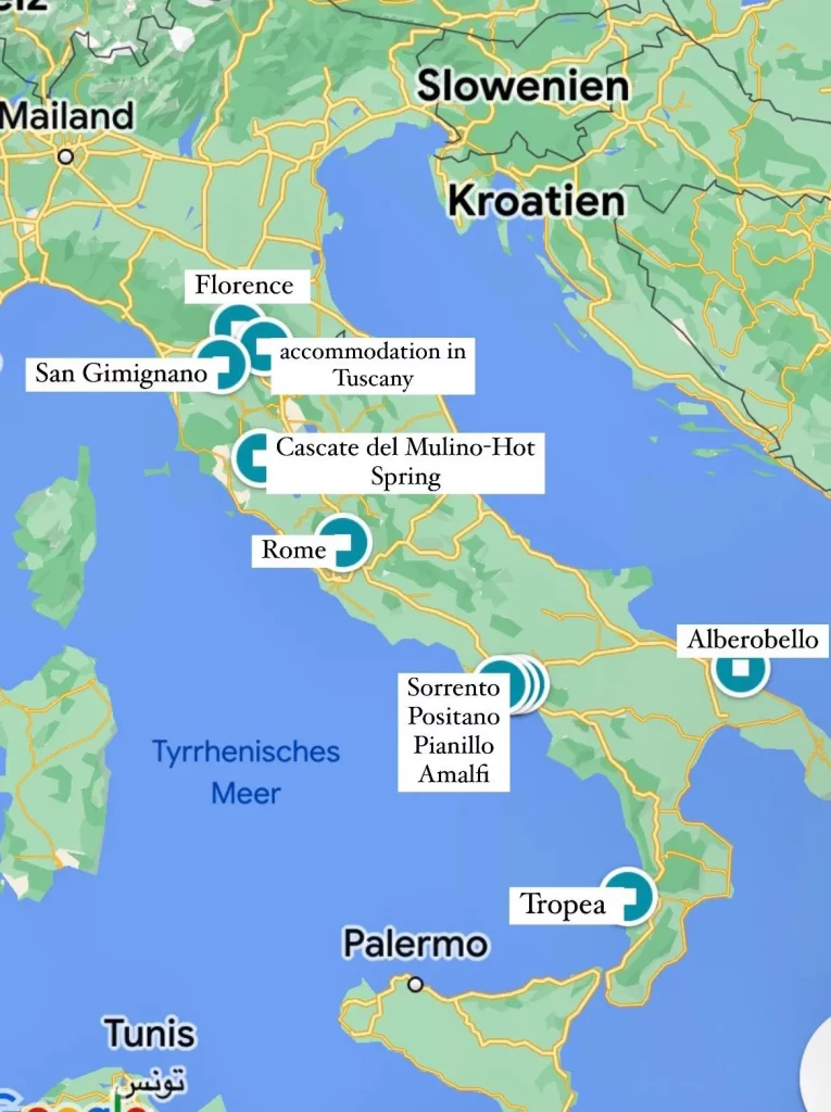 Unsere erste Station war Florenz, eine Stadt mit viel Geschichte und Charme. Danach ging es durch die Toskana, vorbei an Weinbergen und kleinen Dörfern, bis wir die Hot Springs erreichten, perfekt zum Entspannen. In Rom haben wir die wichtigsten Sehenswürdigkeiten erkundet und die italienische Küche genossen, bevor es weiter nach Alberobello ging, bekannt für seine besonderen Trulli-Häuser.