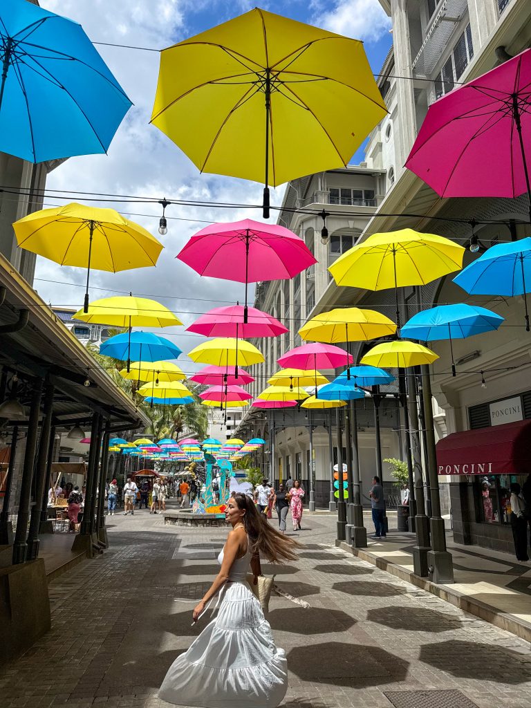 Port Louis ist die lebhafte Hauptstadt von Mauritius. Der Stadtteil rund um den Waterfront wirkt wie ein kleines Einkaufszentrum im Freien. Besonders auffällig ist die Straße mit den dekorativen Regenschirmen, die ein buntes und charmantes Flair verbreitet.