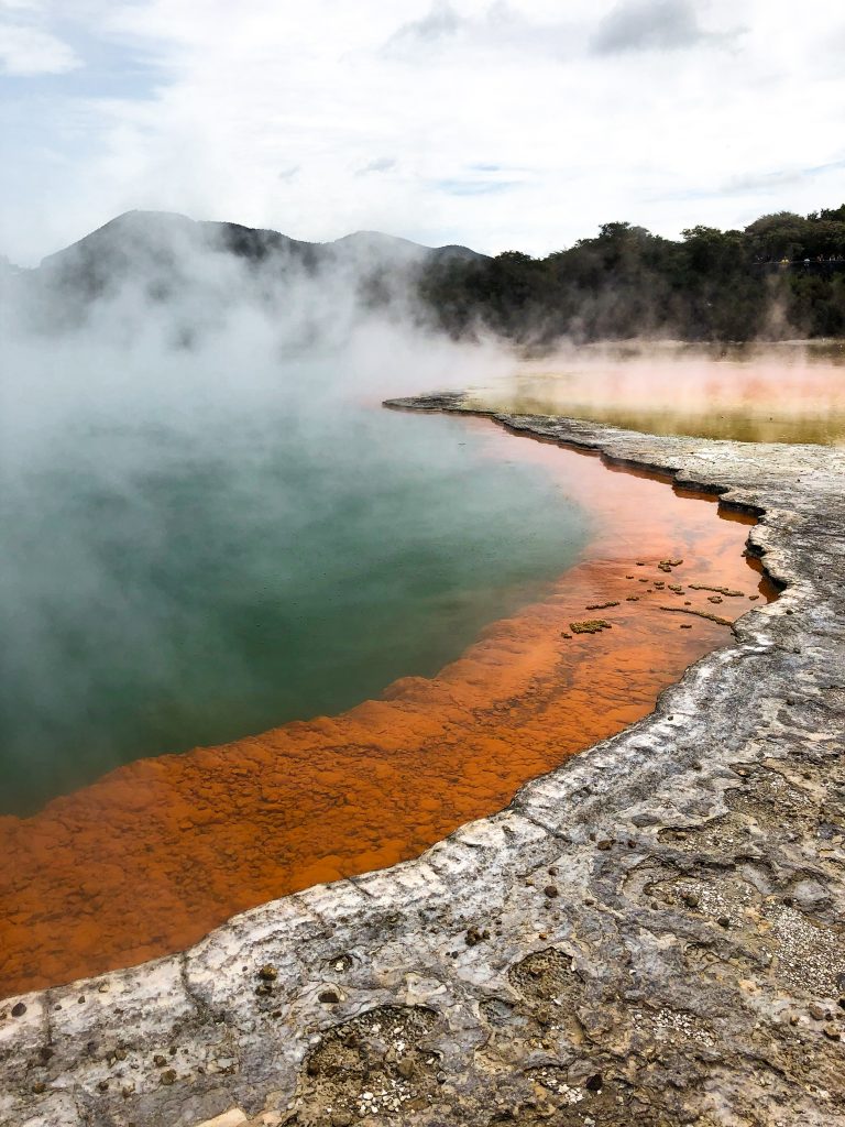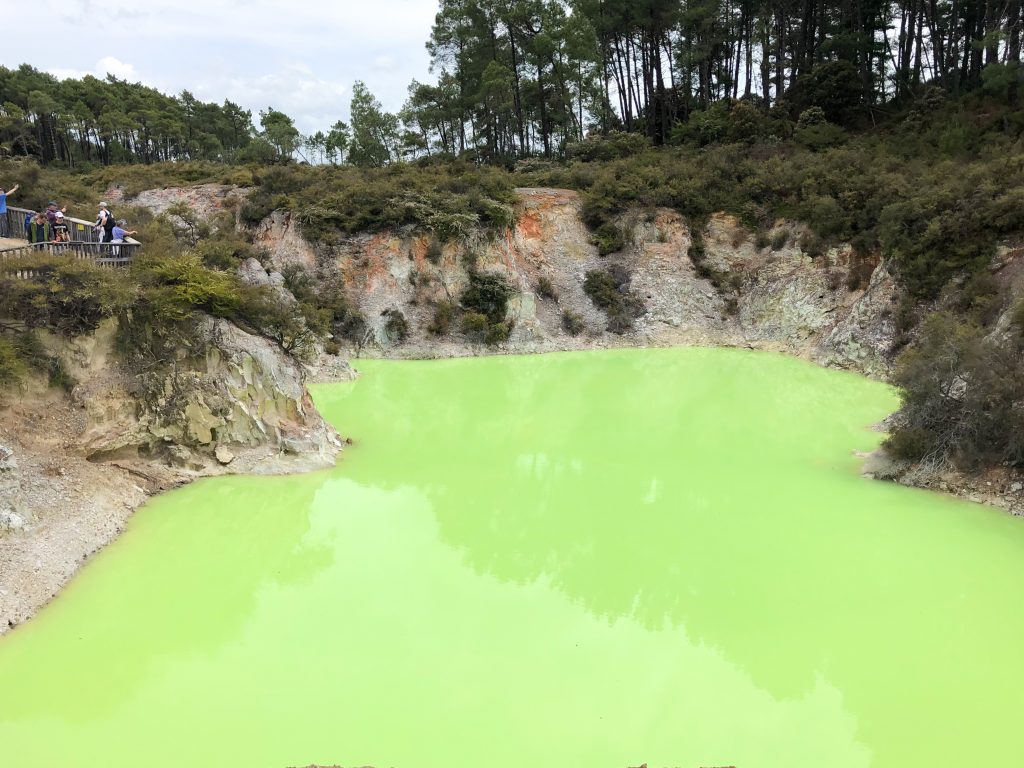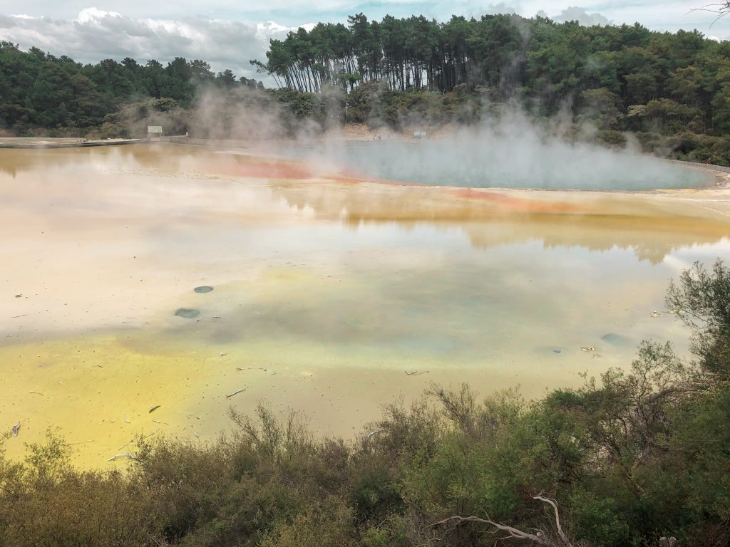 Von Taupo aus sind wir in etwa 1 Stunde mit dem Auto (ca. 80 km) nach Rotorua gefahren. Rotorua ist besonders bekannt für seine geothermischen Aktivitäten, die mitten in der Stadt erlebbar sind. Überall steigen Dampfwolken auf, es gibt heiße Quellen, blubbernde Schlammlöcher und aktive Geysire, die den charakteristischen Schwefelgeruch verbreiten, ein klares Zeichen der geothermischen Aktivität.