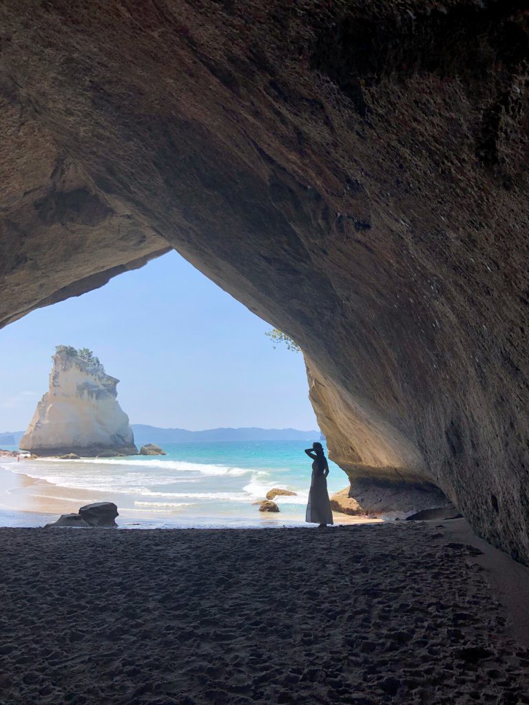 Cathedral Cove ist eine der bekanntesten Sehenswürdigkeiten der Coromandel-Halbinsel in Neuseeland. Die imposante Felsformation mit dem natürlichen Torbogen direkt am Meer ist nur zu Fuß oder per Kajak erreichbar. Der Wanderweg ab Hahei dauert etwa 45 Minuten pro Strecke und führt entlang der Küste mit herrlichen Ausblicken.