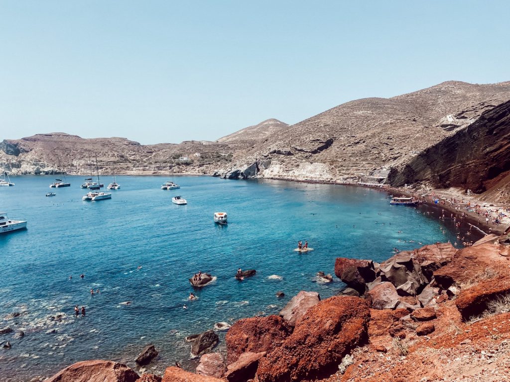 Der Red Beach ist einer der bekanntesten Strände Santorinis und beeindruckt mit seinem roten Vulkansand und den imposanten Felswänden. Er liegt im Südwesten der Insel, etwa 12 km von Fira entfernt.