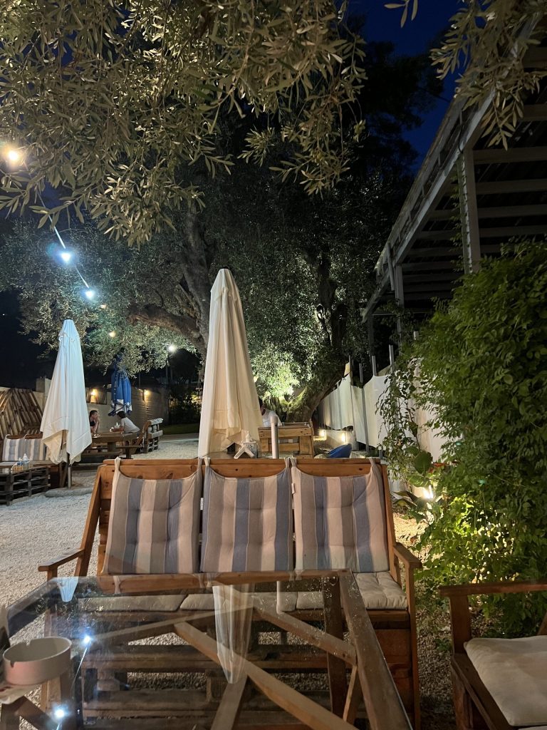 Wer zwischendurch entspannen möchte, kann sich auf einer der bereitgestellten Liegen ausruhen und den Blick auf das Ionische Meer genießen.