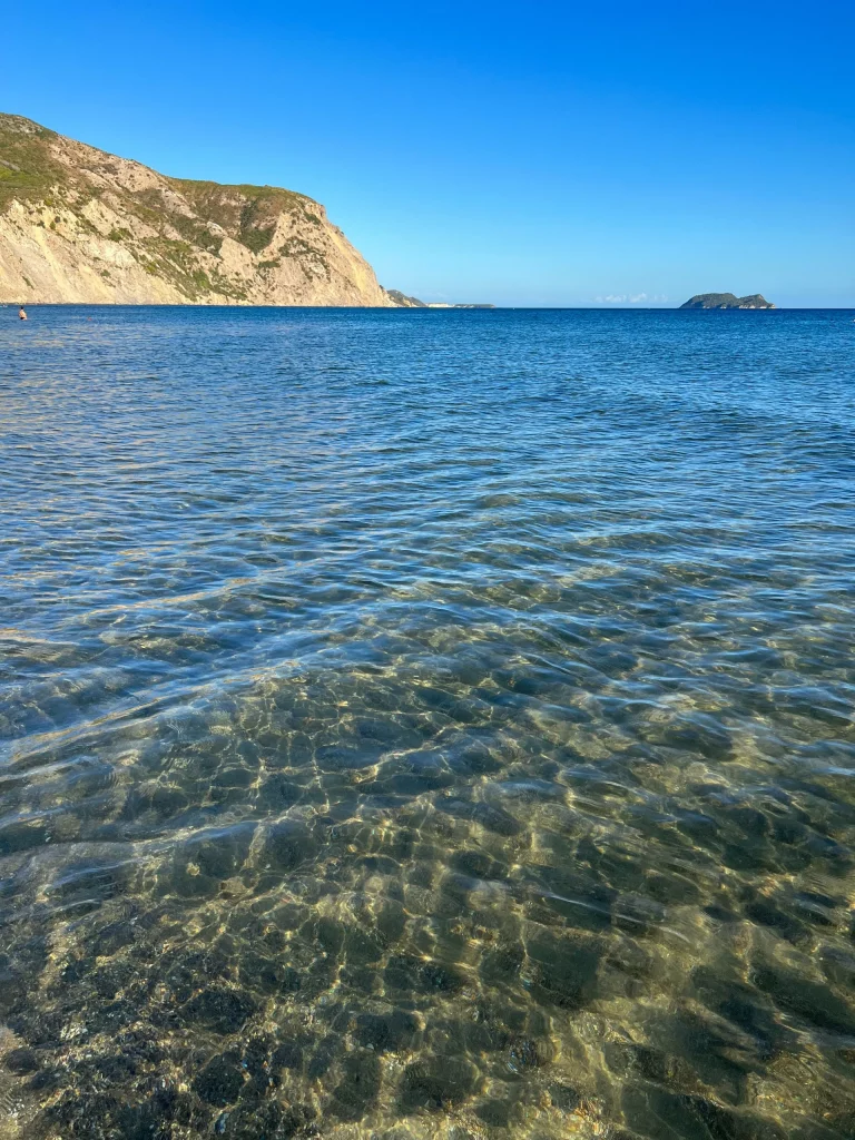 Unbedingt Badeschuhe mitnehmen, da der Kieselstrand und die Felsen den Einstieg ins Wasser erschweren.