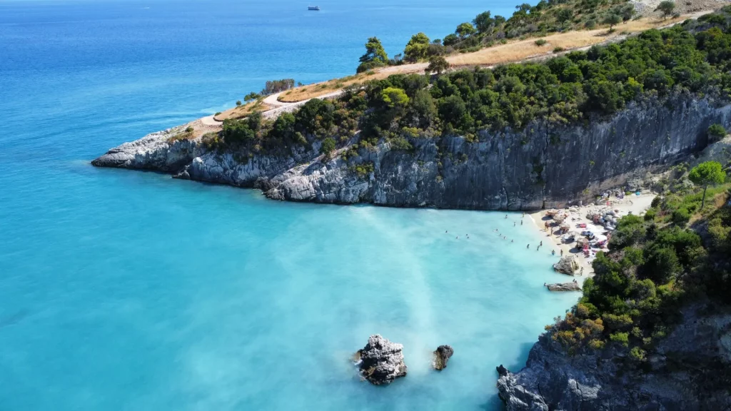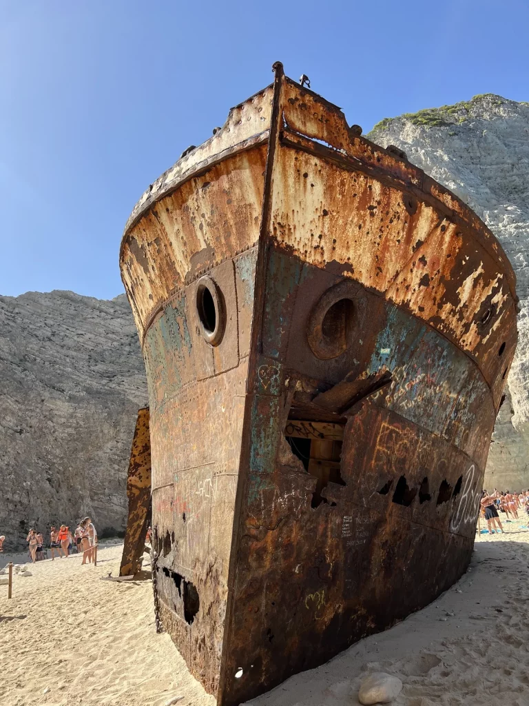Der von imposanten Klippen umgebene Strand ist nur per Boot erreichbar und beeindruckt mit seinem strahlend weißen Kieselsand und dem türkisblauen Wasser. Das Highlight ist das berühmte Schiffswrack „Panagiotis“, das 1980 hier strandete und seitdem ein ikonisches Fotomotiv darstellt.